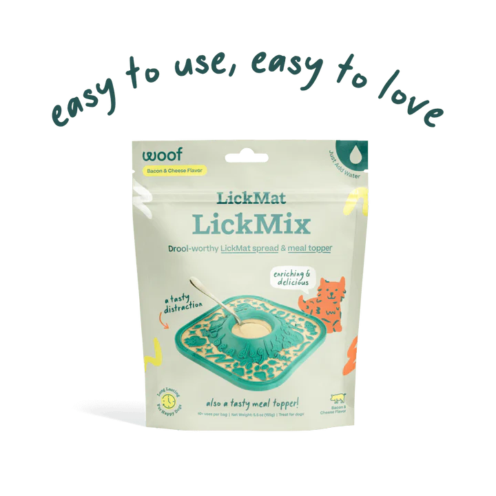 Just scoop LickMix into the LickMat’s built-in mixing bowl or the Woof Shaker Bottle, add 1:1 ratio of water, spread, and serve.